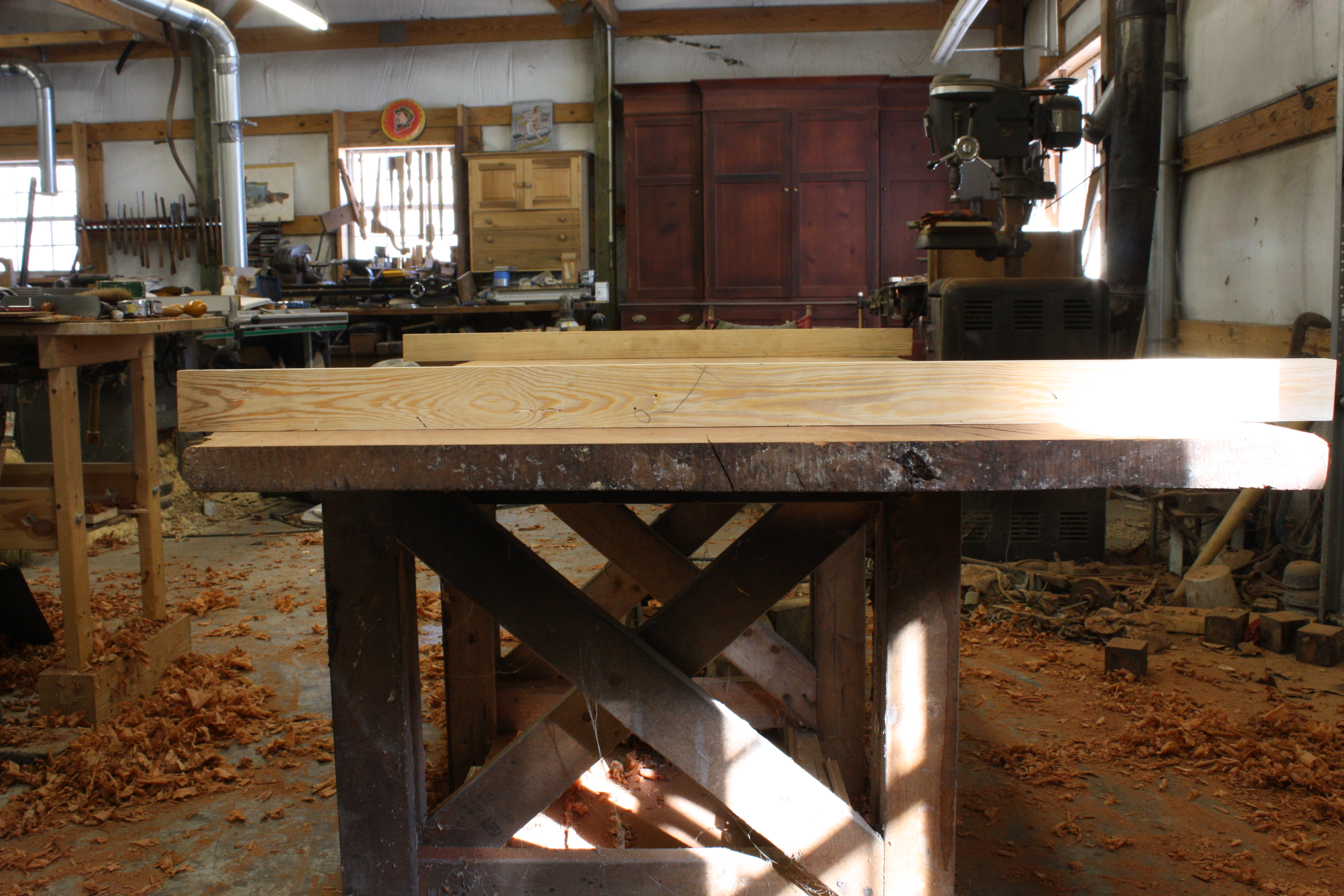 This will be the top of the table. It is 1 3/4″to 1″in thickness x 38 1/2″ wide x 6′ long. Because it is so wide there isn’t a planer that can thickness it . So I started with the bow side up and with my hand planes have been dressing this side. The under side will be left with the band saw marks and the far end will be left with the axe notch and crosscut saw marks.