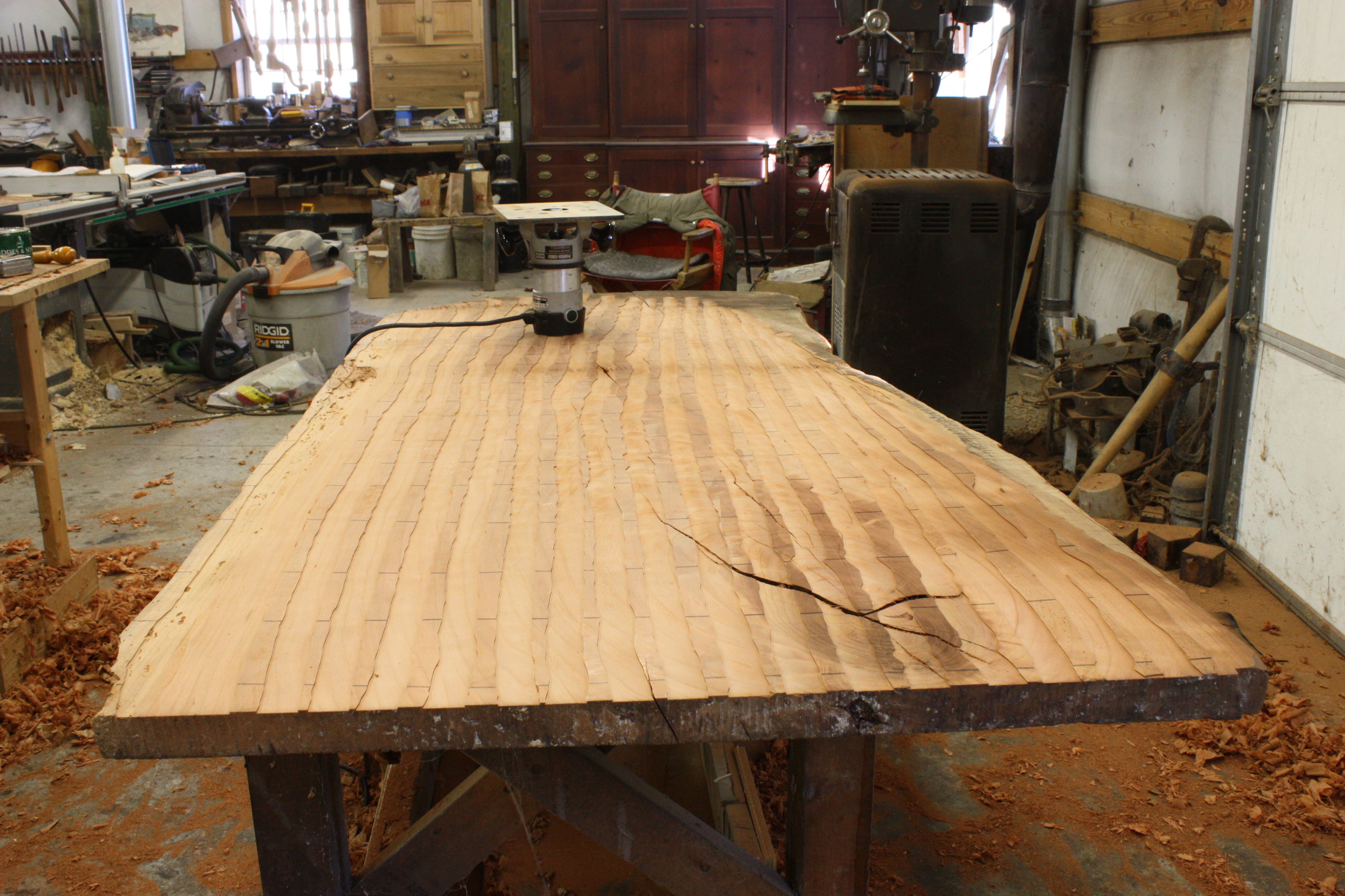 After leveling about a third with hand planes I started using a router and a 1 1/2″ bit to make a row of cut 1/16″ deep. Then I would remove every other one out with the router.