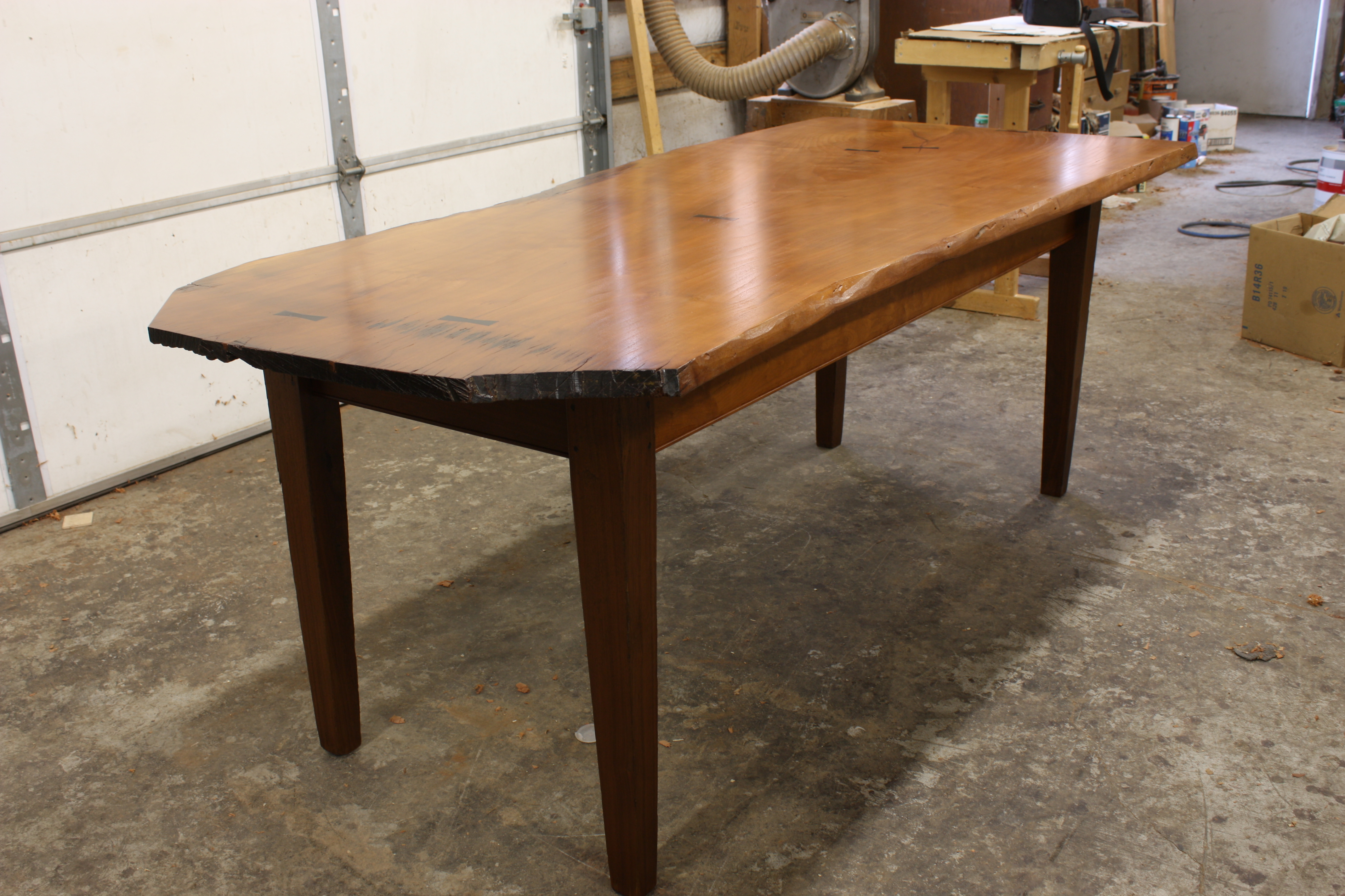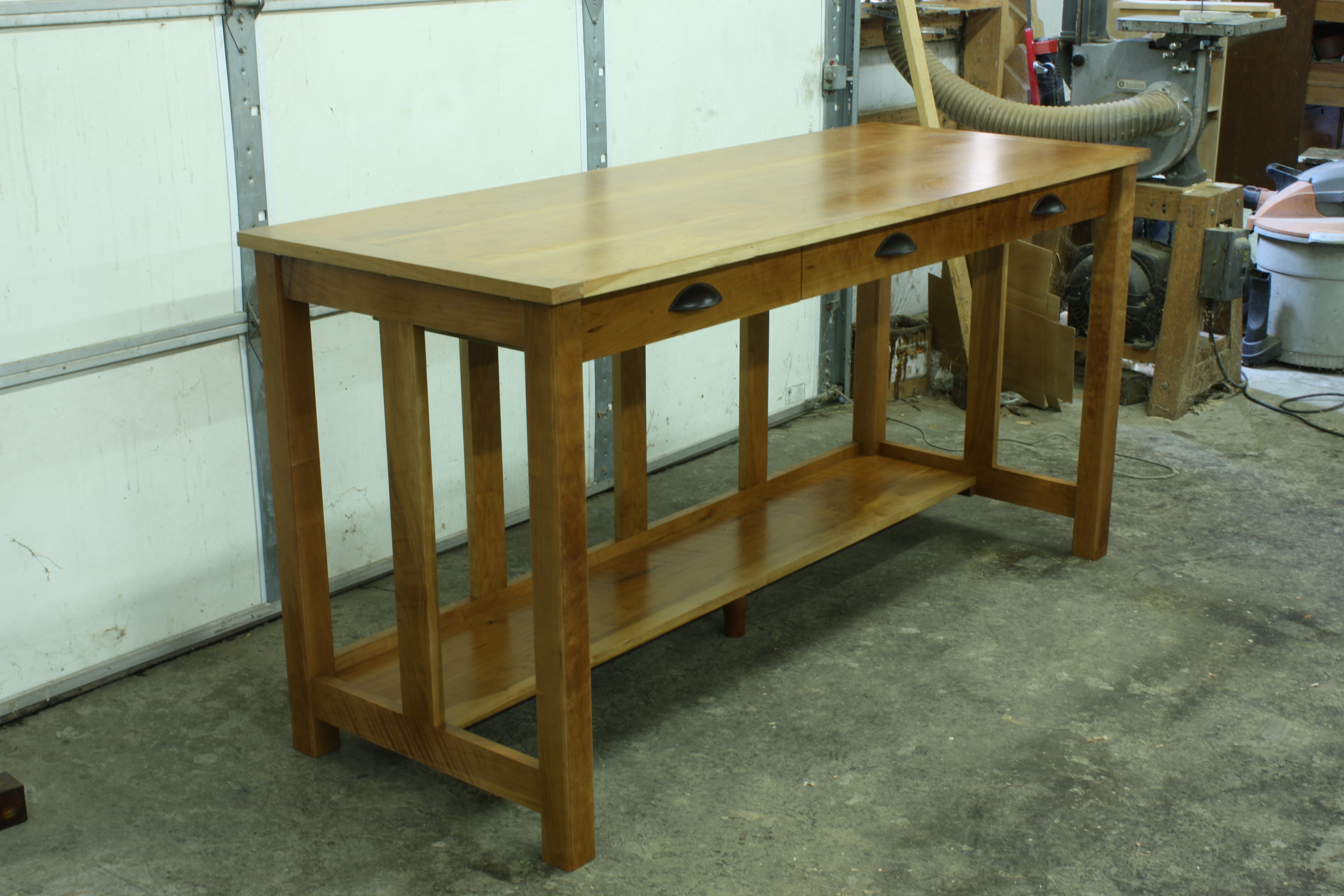 This is a recently finished commission in cherry. The clients wanted a worktable in their kitchen. Also they wanted saw marks to show and sapwood left in the boards. I ask him to come over when I was planing to tell me when to stop so he could have the saw marks left. The cleats on the top or as some call them breadboard ends have four deep tenons into the cleats. The tenons are dead tight in thickness and are only glued on the inside of the center tenons. In width the sides of the tenons are cut loose to allow for expansion and contraction . The dimensions are: Height 36″, Width 72″, Depth 28″. This commission took 90 hours to complete.