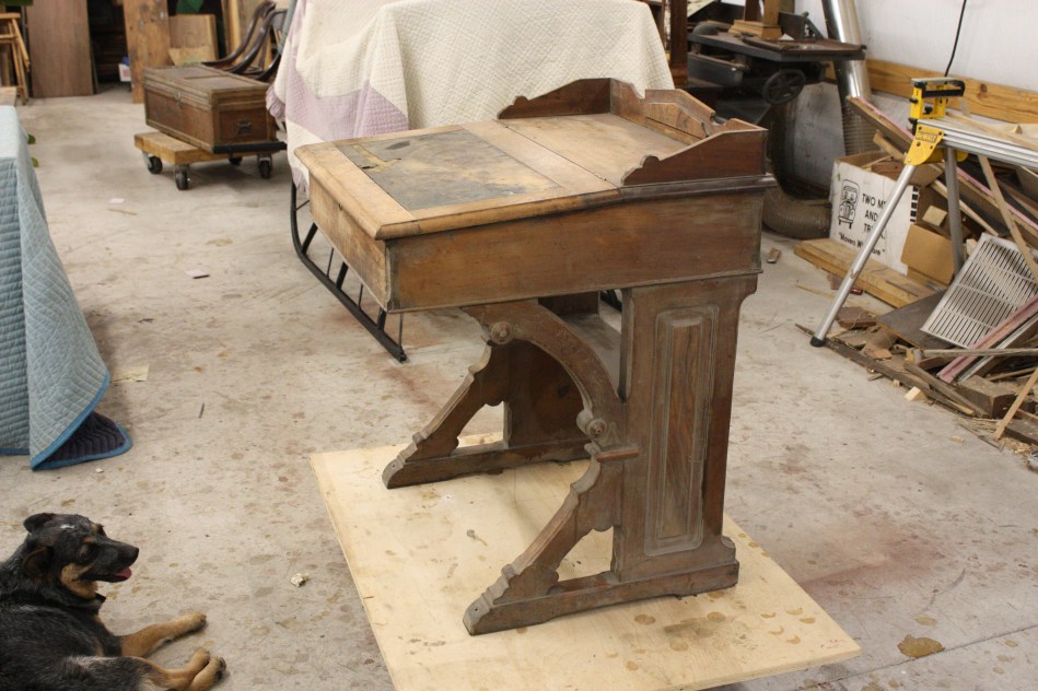 This desk came into the shop with no finish on it.It was also streaked with water marks.There was 75-80 % of the writing surface missing. One of the turned rosettes was missing as well as some return molding. Below the desk is a book self. Some earlier repair work had placed the partition for the bookshelf on the wrong side.