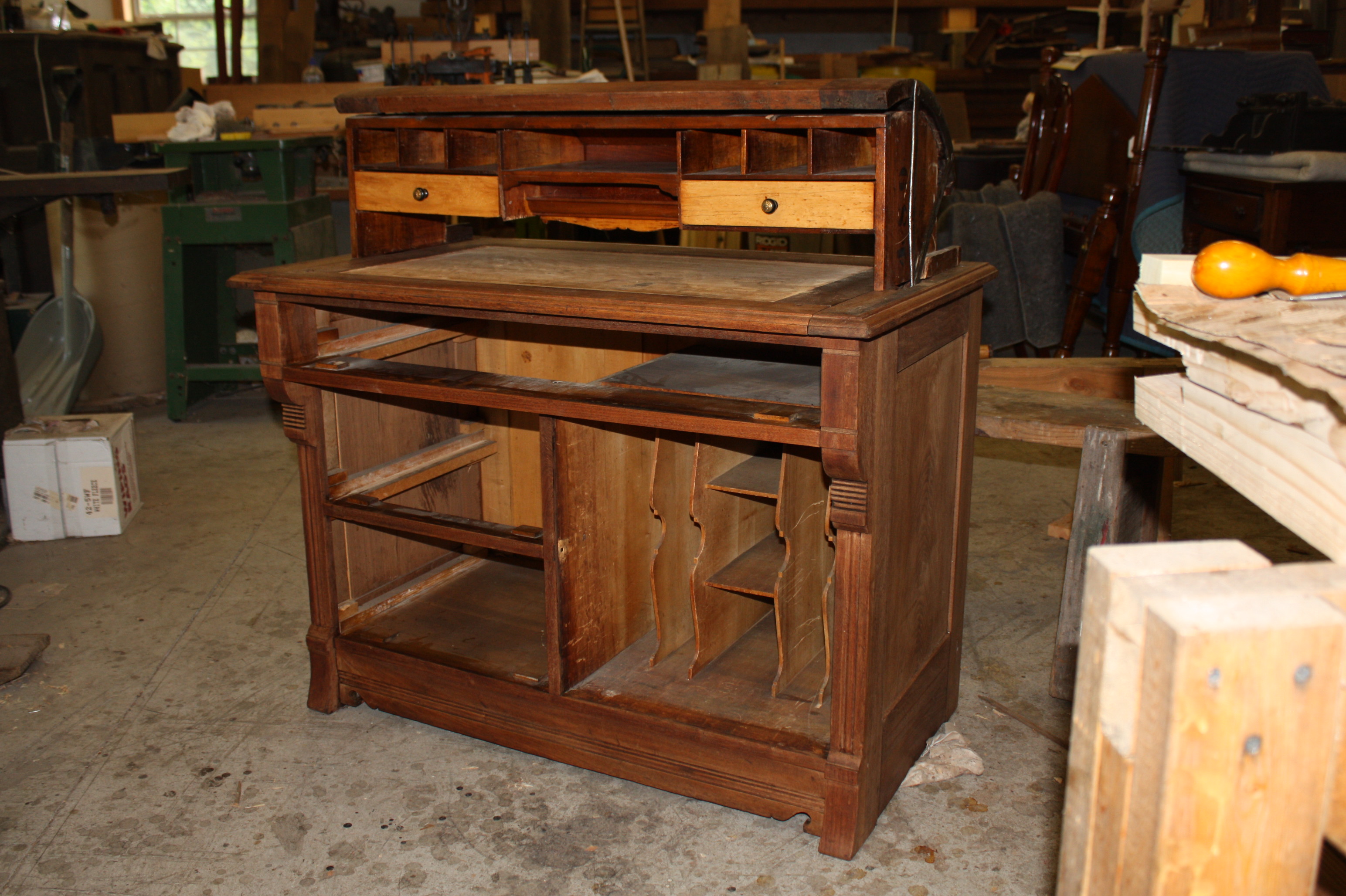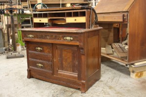 This is an Eastlake Cylinder Desk (1880’s) that I recently found. At first glance it didn’t look like to much was wrong with it. Once I had it in the shop I could see it need some attention. There was a poor lacquer finish on it. The writing surface was covered in cheep red felt and would not slid out. The pivots for the cylinder were worn out. Not shown is the upper book case that covers the cylinder and pigeonhole interior. I’ll cover that in another post. The lower photo is after being stripped.